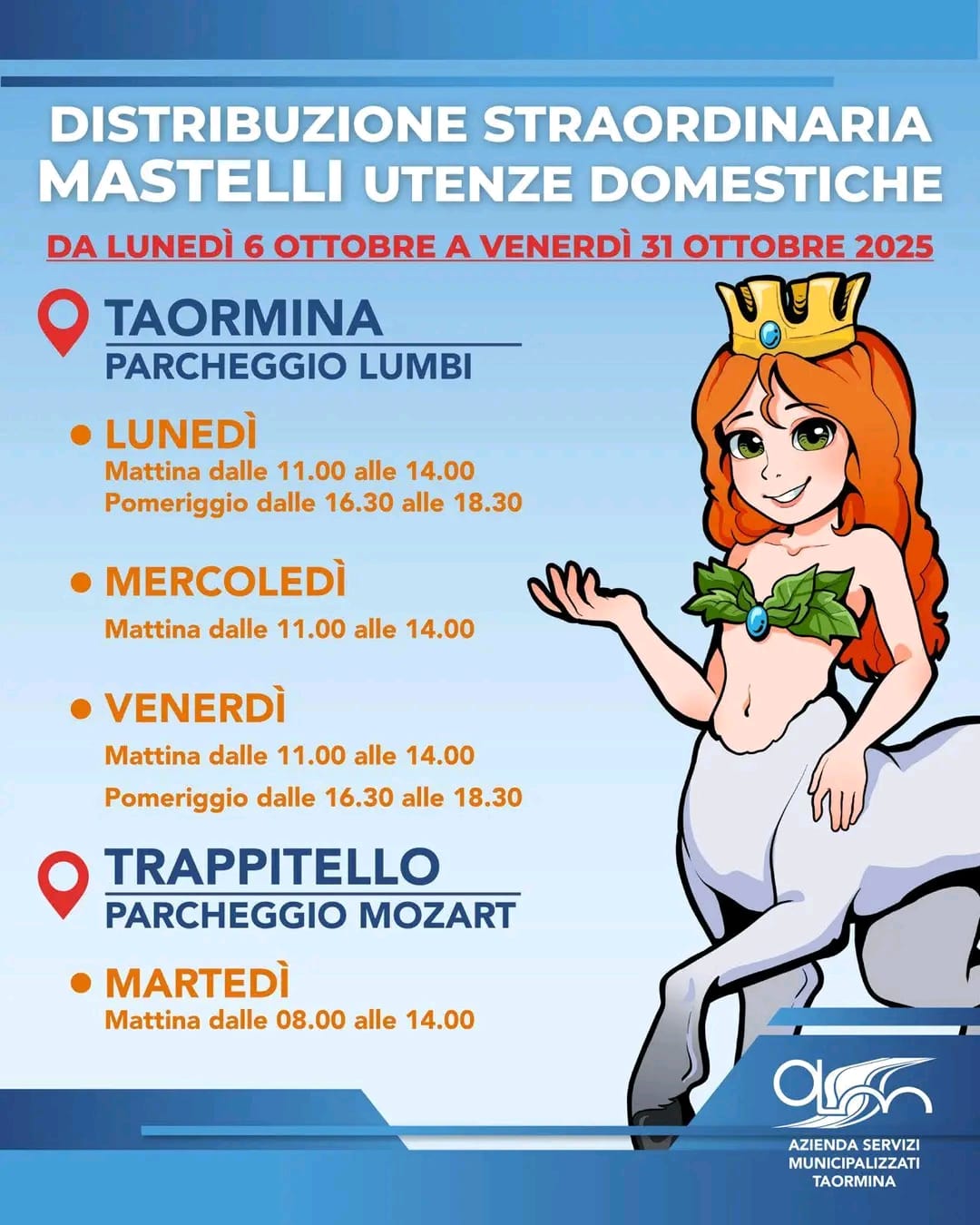 ASM Taormina informa che è stata programmata un’ulteriore  CONSEGNA STRAORDINARIA DEI MASTELLI per le UTENZE DOMESTICHE da lunedì 6 ottobre a venerdì 31 ottobre 2025 presso i seguenti punti: