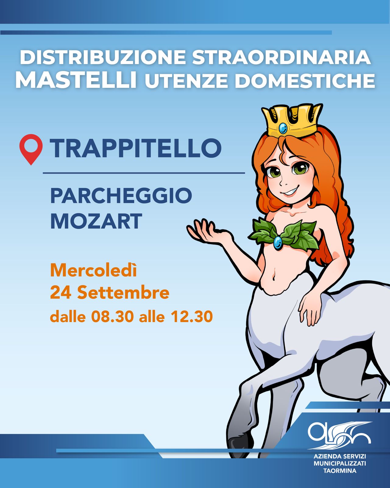 ASM Taormina informa che continua la DISTRIBUZIONE STRAORDINARIA DEI MASTELLI per le UTENZE DOMESTICHE  a Trappitello mercoledì 24 settembre 2025  presso il parcheggio Mozart dalle 0re 8:30 alle ore 12:30
